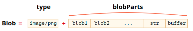 Blob 由一个可选的字符串 type(通常是 MIME 类型)和 blobParts 组成 —— 一系列其他 Blob 对象,字符串和 BufferSource。